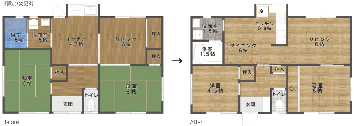 そのため新たな賃借人が入居しづらく、さらに賃貸料も安価なので収益が上がらないという悩みがあります。そこで、古い平屋の価値を高める定額制リノベーションプランをこ提案します。パッケージ化された間取りと、元の平屋の素材を最大限生かしたリノベーションでコストダウンを実現。